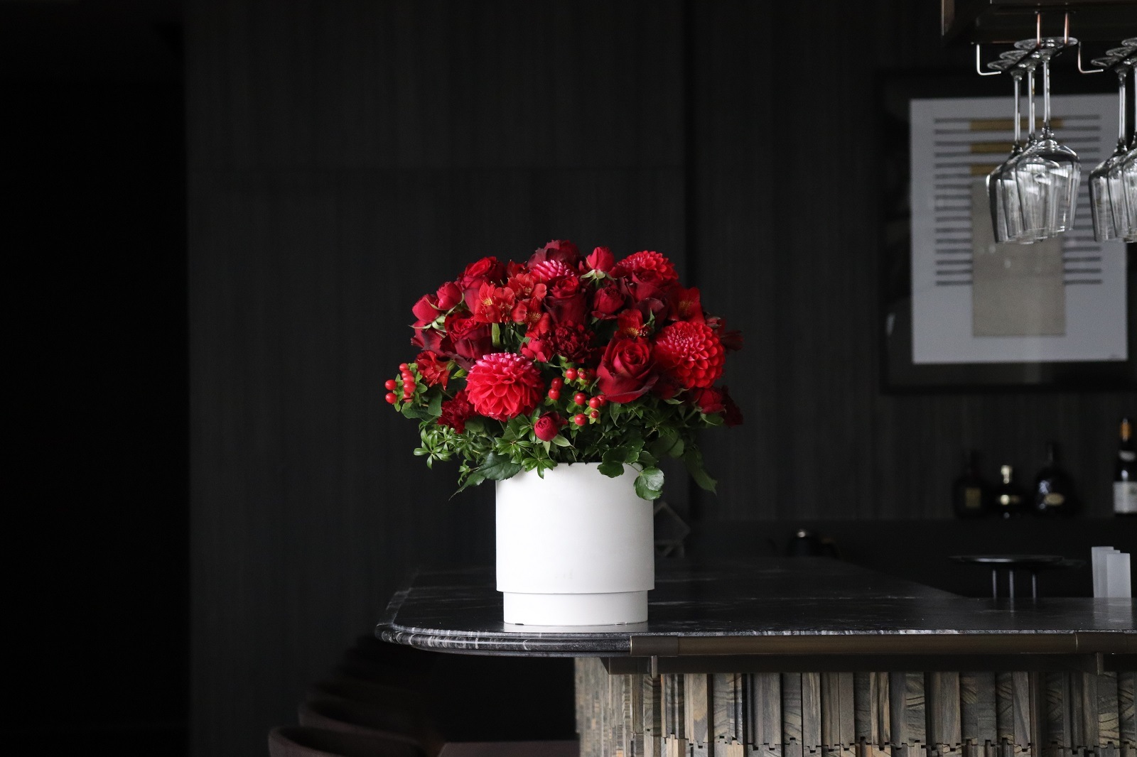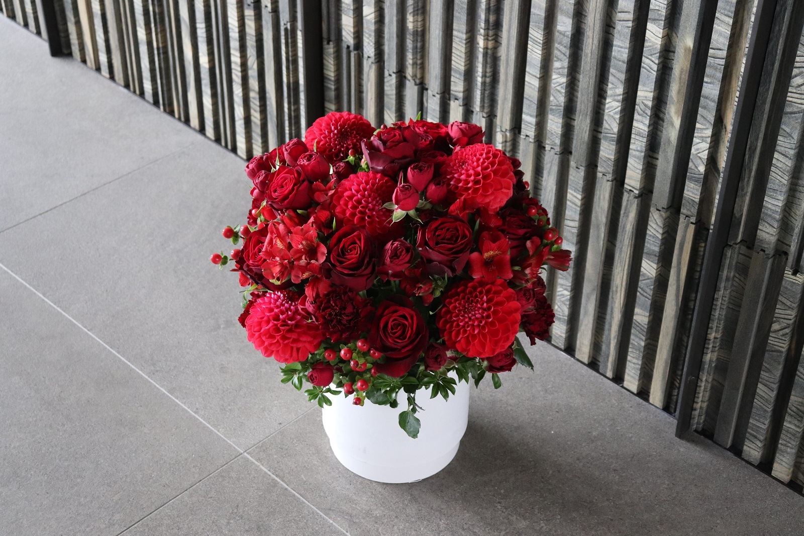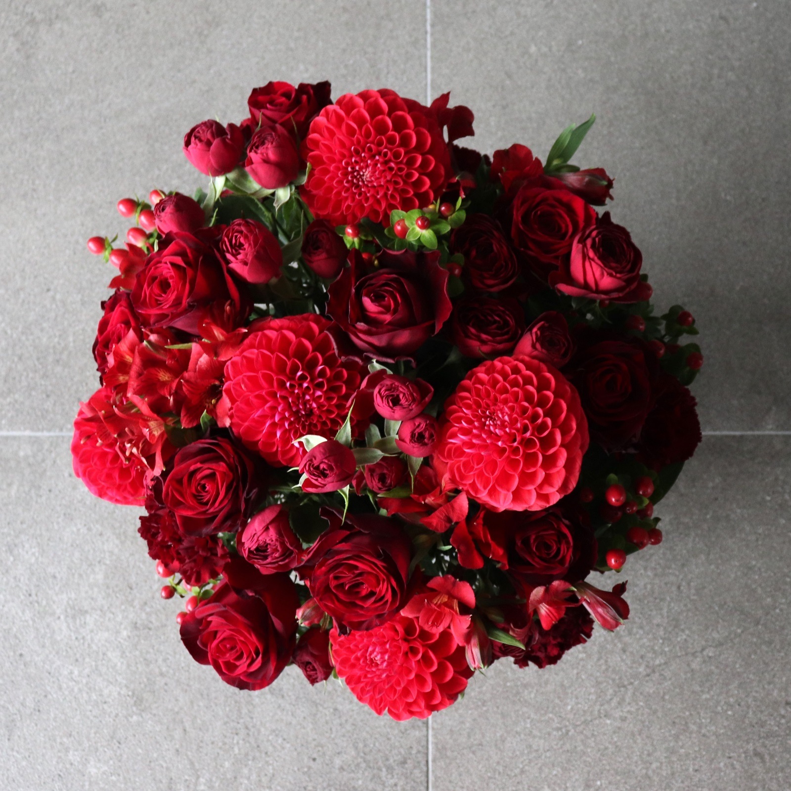 レッドグラデーションの花々でまん丸にアレンジされた「グランデ」は、花は吸水性のスポンジに挿してあるので、花瓶もいらず、送り先様の手を煩わすこともありません。誕生日、お見舞い、記念日、送別、コンサートなど、さまざまなお祝いのシーンにおすすめです。