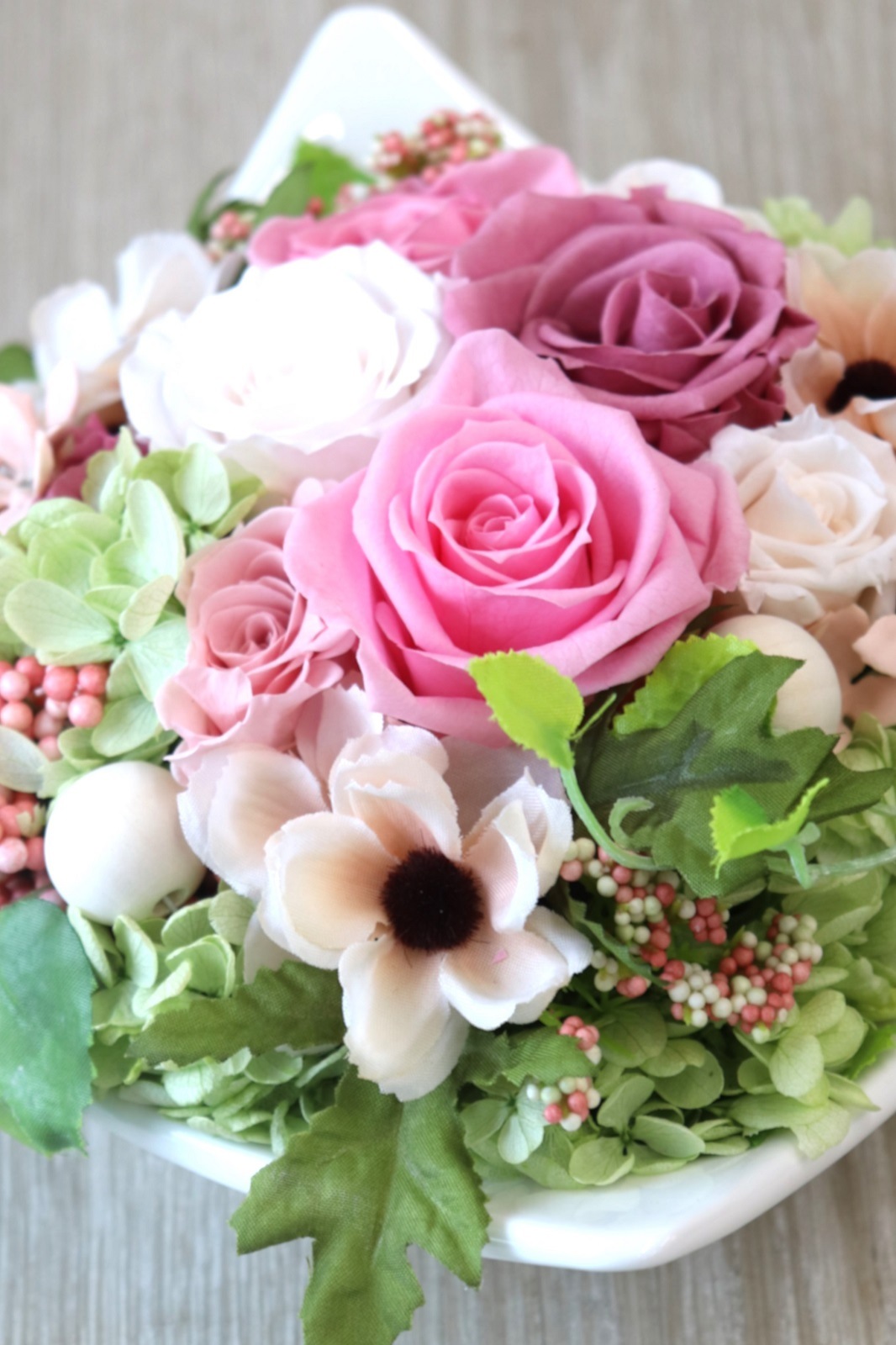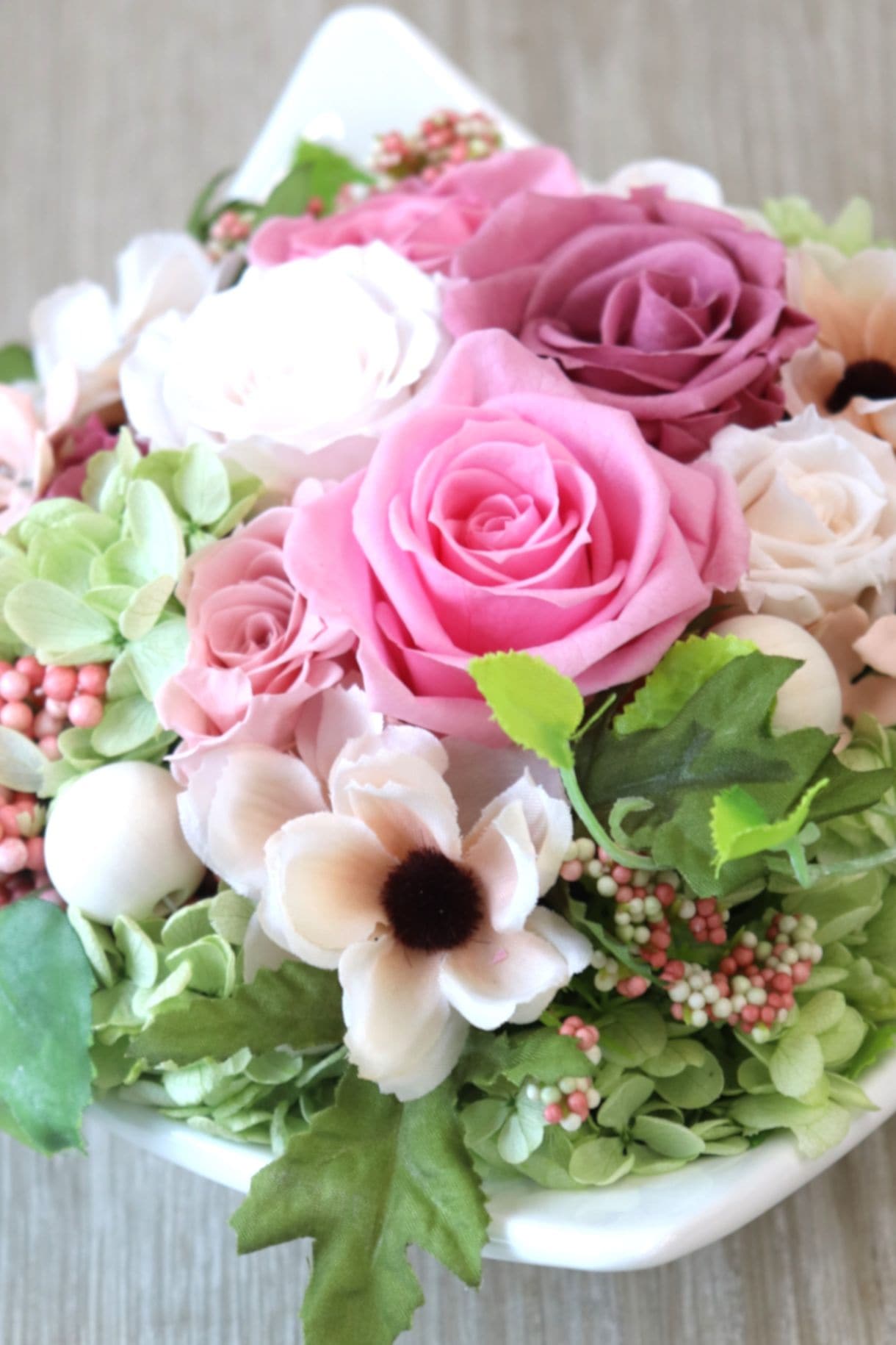 生花を加工した枯れないお花、 プリザーブドフラワー。 発色の良さとみずみずしさを長い間お楽しみいただけます。 アーティフィシャルフラワー(人工の造花)と一緒にアレンジすることで、より一層生花に近く見え、鮮やかな発色やユニークなデザインが魅力。クリアケース入りなので、ホコリも立たず、ずっと残る記念ギフトとして、喜ばれているアイテムです。