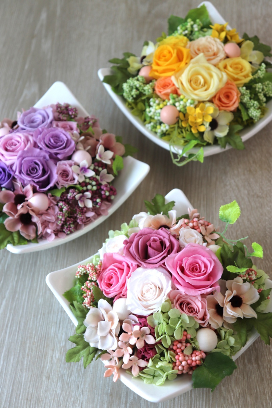 ホワイトのモダンなお皿に、バラを敷き詰めたデザインはプリザならでは。高さを抑えたデザインは安定感もあり、センターピースとしても飾っていただけます。