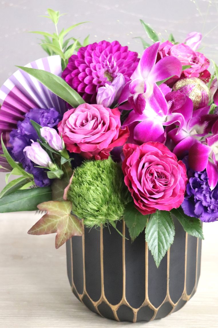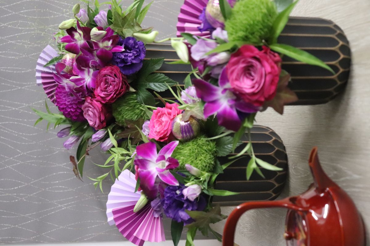 古くから「尊敬」を意味する高貴な色「紫」に縁起の良い「扇」で尊敬と幸せの想いを込めた秋色アレンジメント。