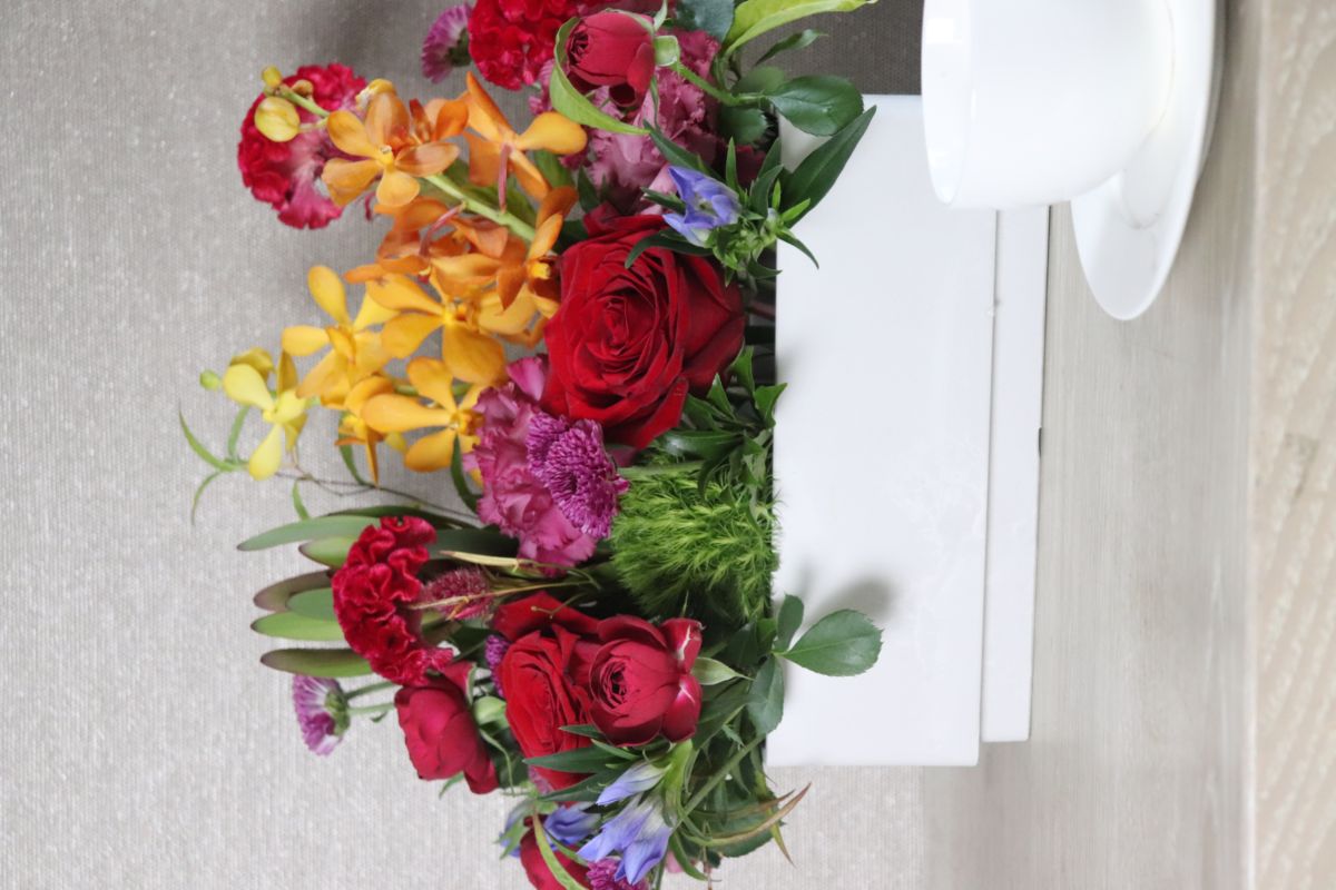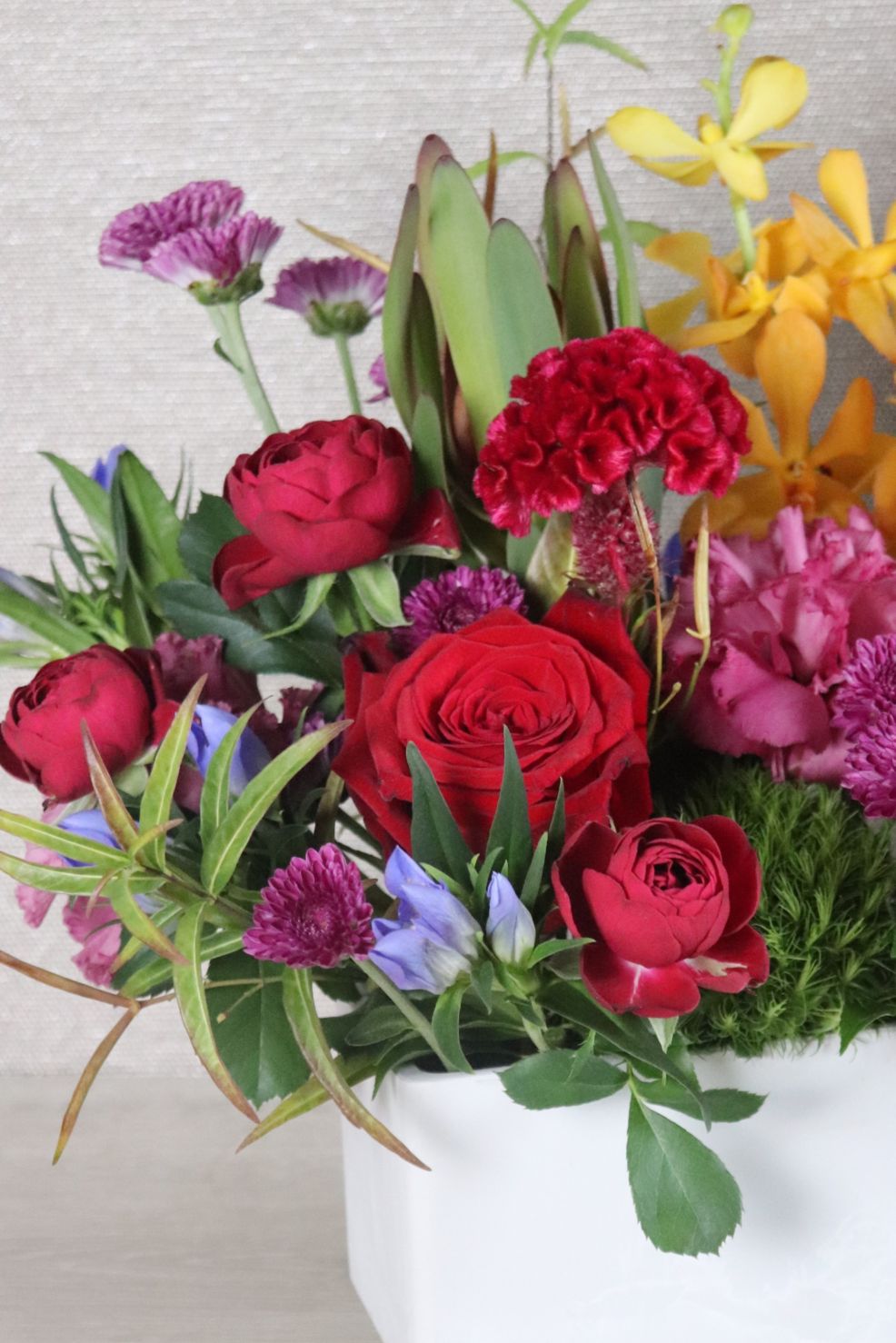 フレッシュフラワー:バラ・スプレーバラ・リンドウ・マム・ケイトウ・モカラ・リューカデンドロン