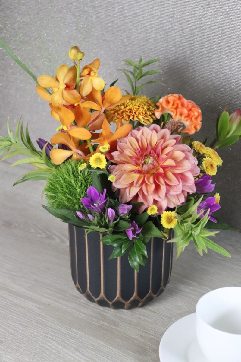 ケイトウ、リンドウ、マムで脇役を固めた秋を堪能できる美しいアレンジメントです。