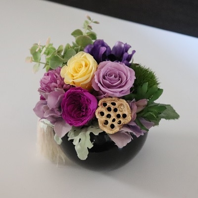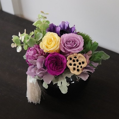 清らかで穏やかな色合いで、プリザーブドフラワーをアレンジしました。 心よりの哀悼と追悼の思いを込めて・・・ 仏事、命日等、ご利用ください。