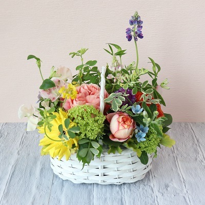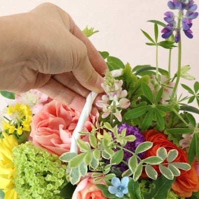 - まるで赤ずきんちゃんが森で摘んできたかのような春らしく楽しいアレンジメント。花は吸水性のスポンジに挿してあるので、花瓶もいらず、送り先様の手を煩わすこともありません。誕生日、お見舞い、記念日、送別、コンサートなど、さまざまなお祝いのシーンにおすすめです。