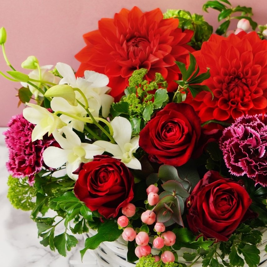- お祝い事に最適な、紅白の花々と優しい色合いのグリーンで華やかに彩りました。花は吸水性のスポンジに挿してあるので、花瓶もいらず、送り先様の手を煩わすこともありません。誕生日、お見舞い、記念日、送別、還暦お祝い、コンサートなど、さまざまなお祝いのシーンにおすすめです。
