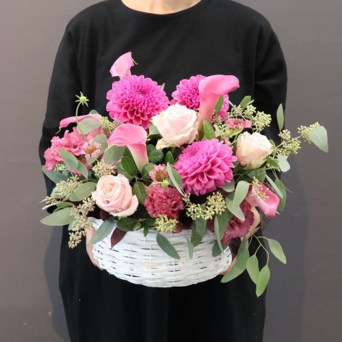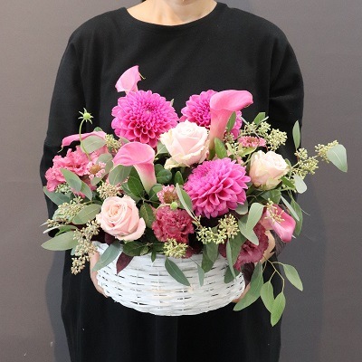 - ピンクグラデーションの花々と優しい色合いのグリーンで華やかに彩りました。花は吸水性のスポンジに挿してあるので、花瓶もいらず、送り先様の手を煩わすこともありません。誕生日、お見舞い、記念日、送別、コンサートなど、さまざまなお祝いのシーンにおすすめです。