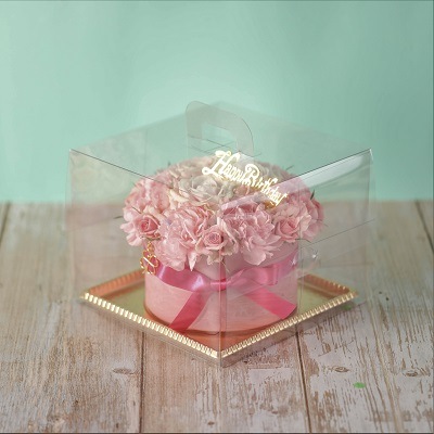 まるでケーキのように、透明のケーキ箱に入れてお届けします。