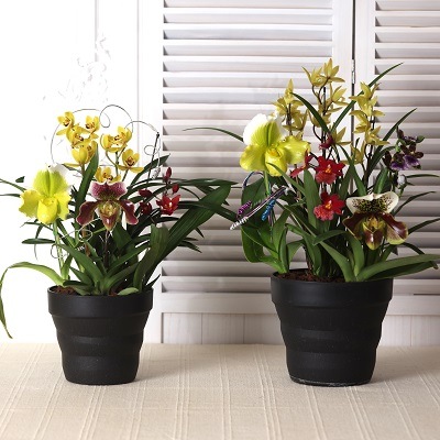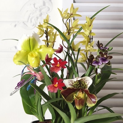 パフィオペディルム、紫香蘭など旬の洋蘭の寄せ植えは、