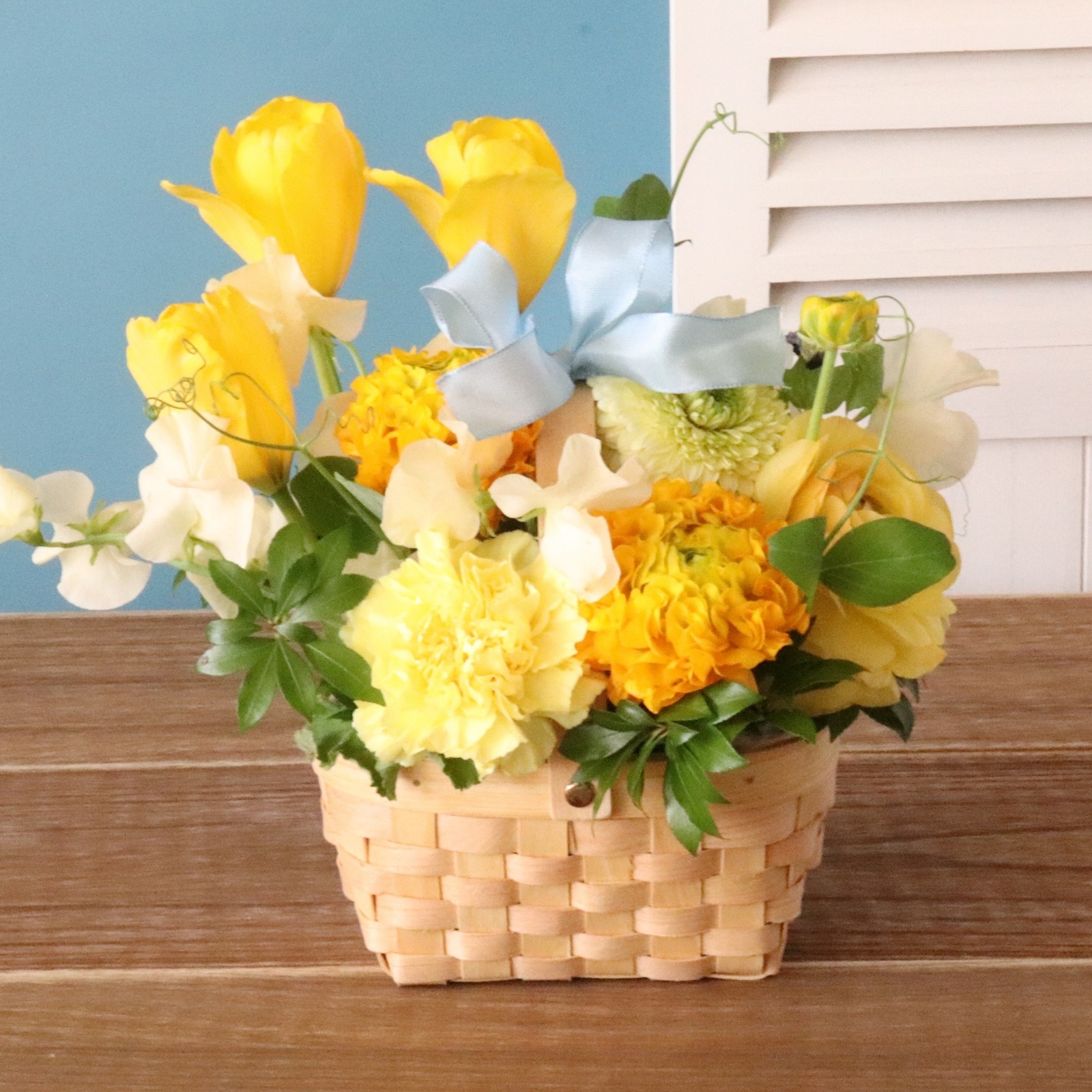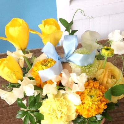 爽やかな春の黄色い花々にキュッと結んだ水色のリボンがポイント。