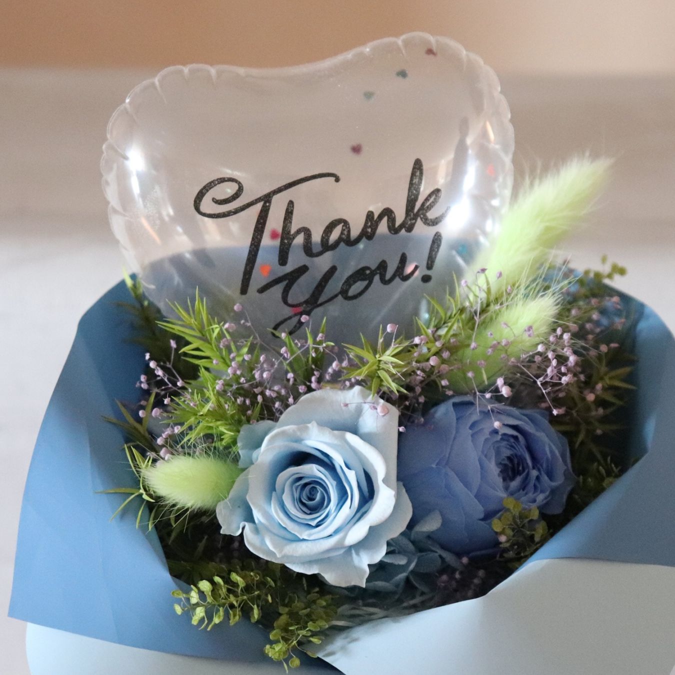 可愛らしいお花に「Thank you」のバルーンを添えたキュートなアレンジメント。