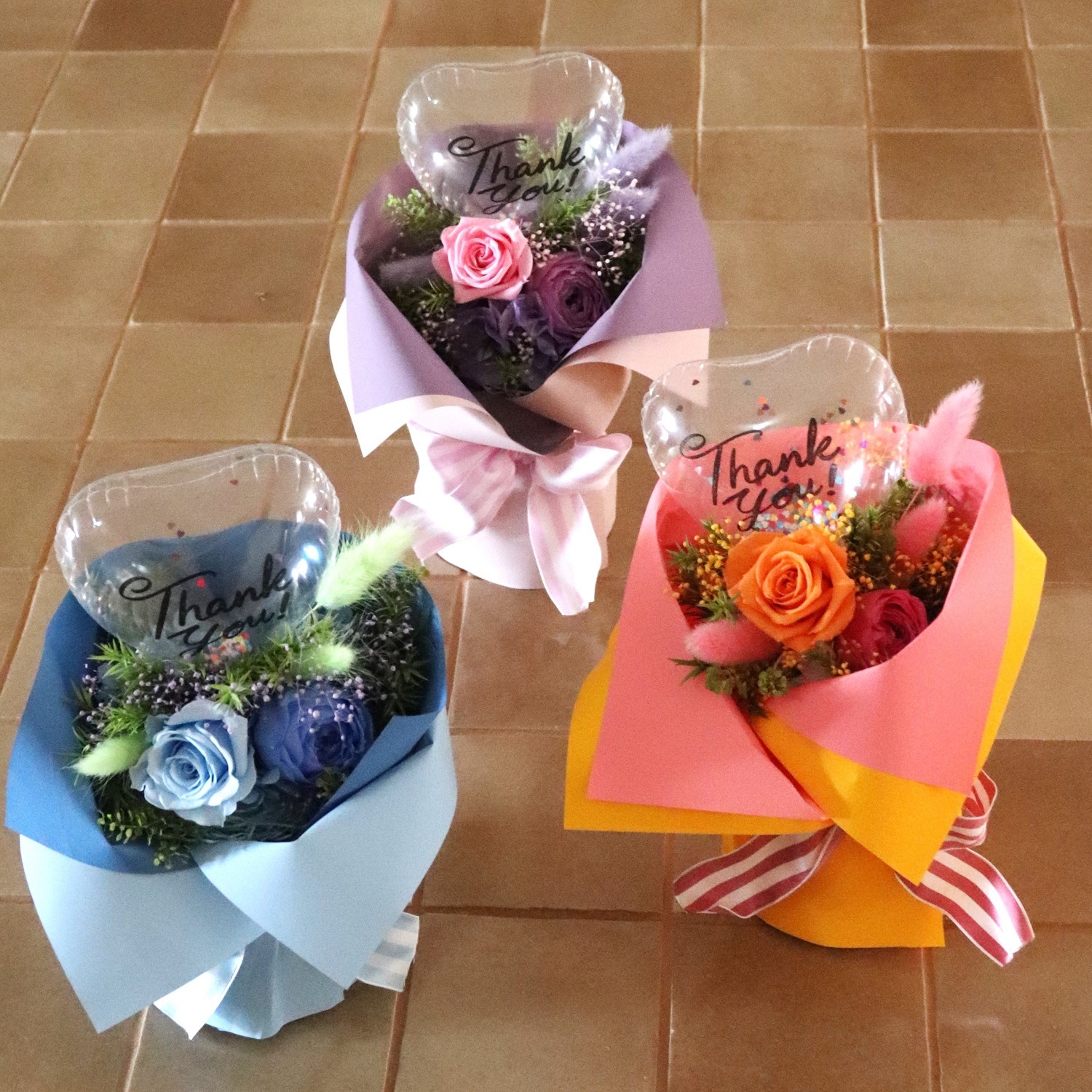 資材:プラスチック製スタンディングブーケ花器・ラッピングペーパー・リボン・クリアケース・お手入れカード