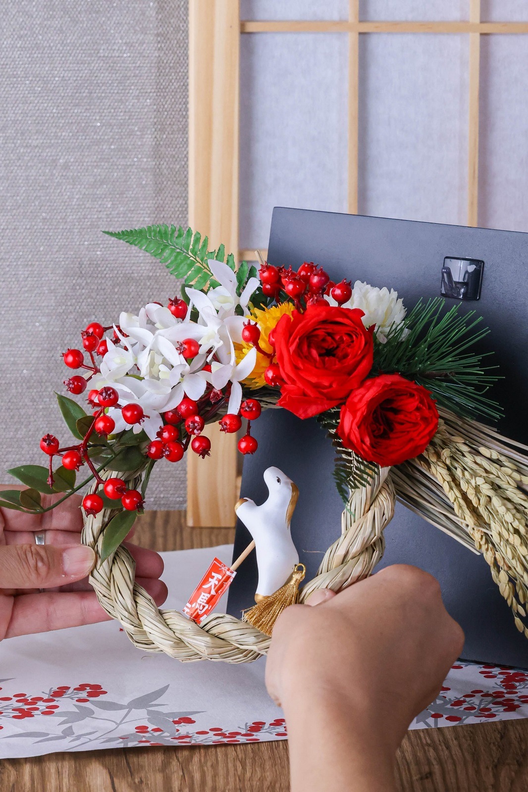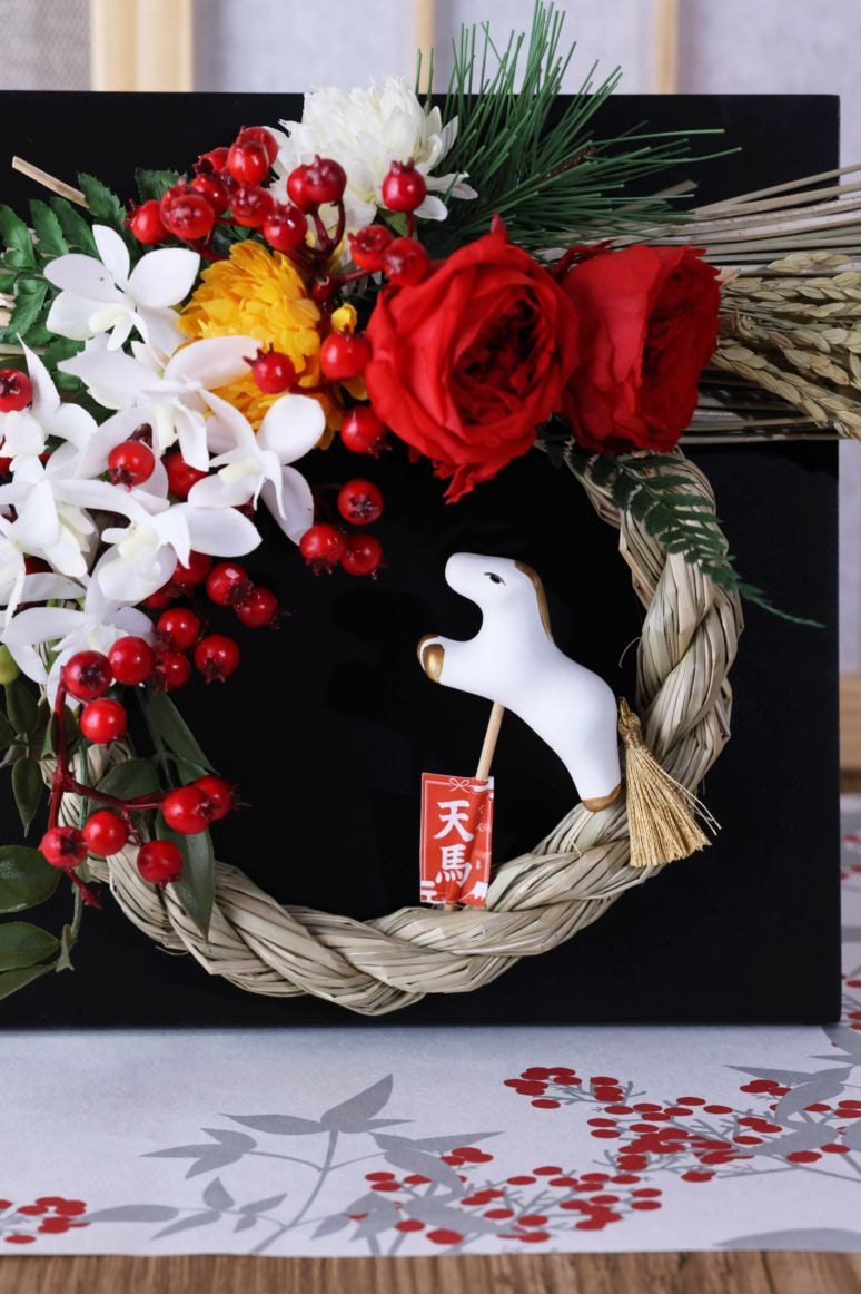 吉報をもたらすと言われている天馬のオーナメント付きの迎春飾りは、木製のボード付きなので、飾る場所を選びません。プリザーブドフラワーのバラが華やかな印象の迎春飾りは、もちろんボードに掛けて飾っても、しめ縄だけでドアに飾ってもお楽しみいただけます。