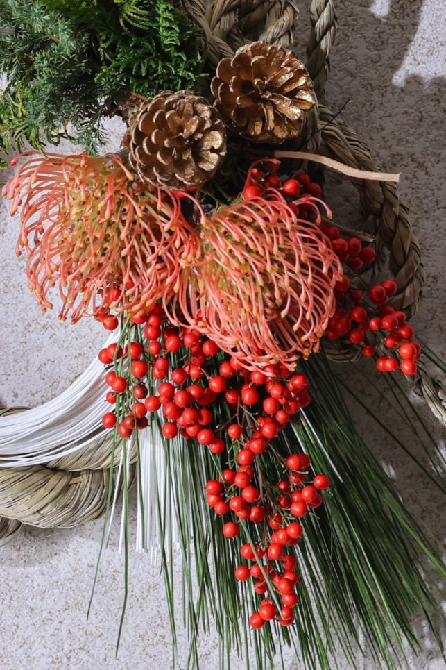 ユニークな花姿の「ピンクッション」は「どこでも成功を」という素敵な花言葉をもっており、「南天の実」は「難を転ずる」という語呂合わせから2026年を飛躍の年にするにはぴったりな迎春飾りです。