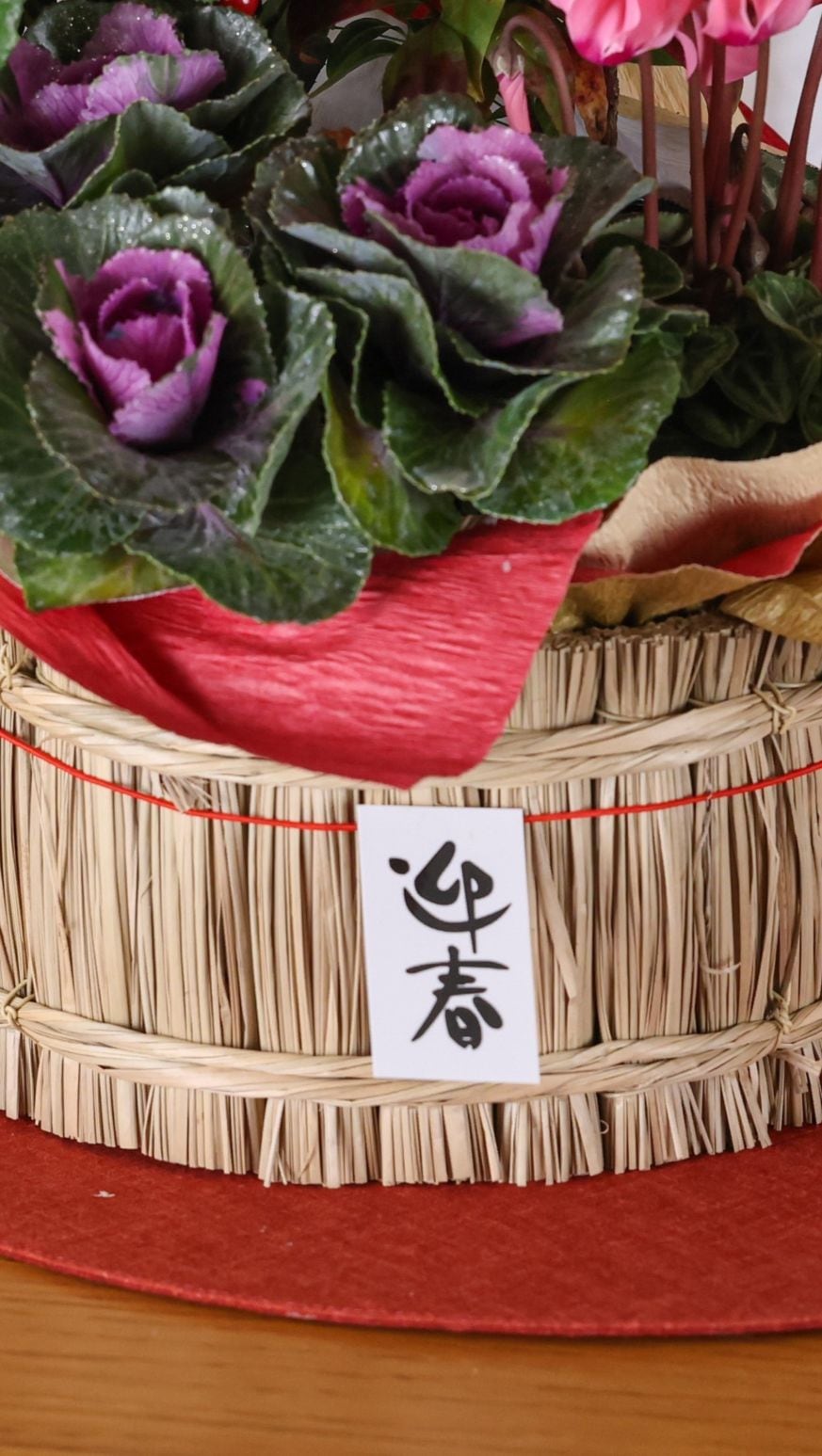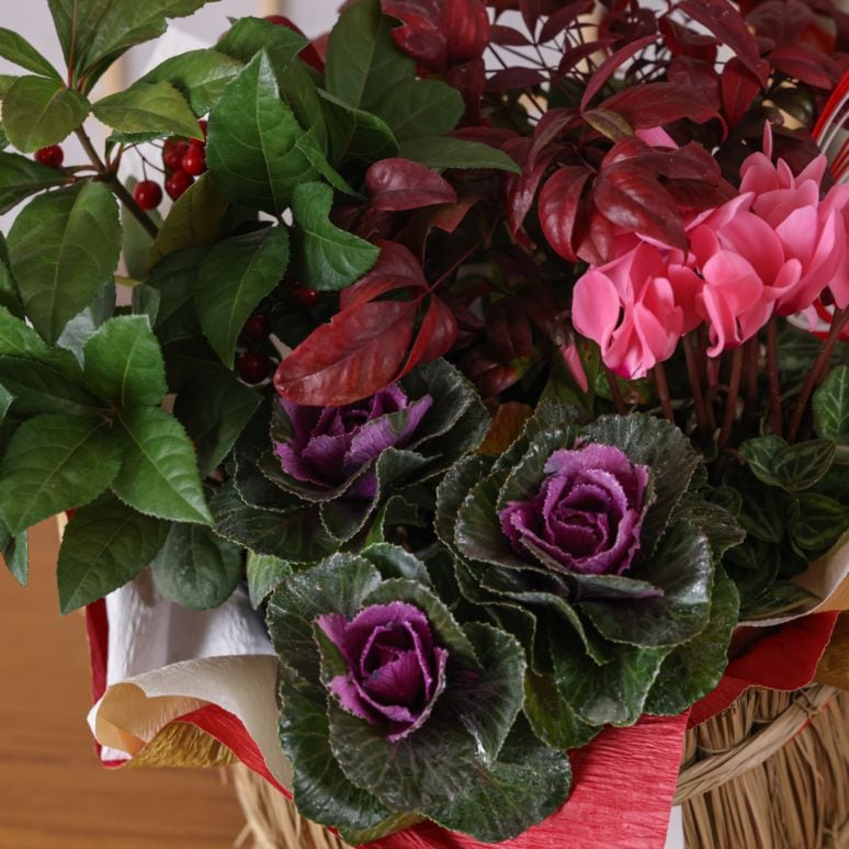 冬の花鉢の代表花、ガーデンシクラメンや葉牡丹などをバスケットに寄せ鉢にしたボリューム感たっぷりなオリジナルプランツ。