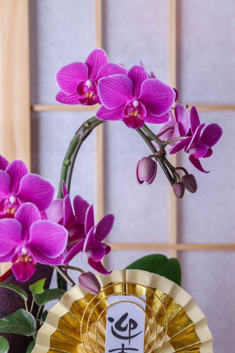 胡蝶蘭(Phalaenopsis)は、縁起の良い花として知られています。花言葉は「幸福が飛んでくる」「純粋な愛」という花言葉を持ち、ポジティブな意味合いがあり、お祝い事や特別な場面で贈られることが多いお花です。