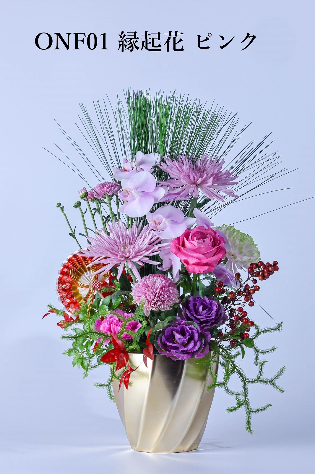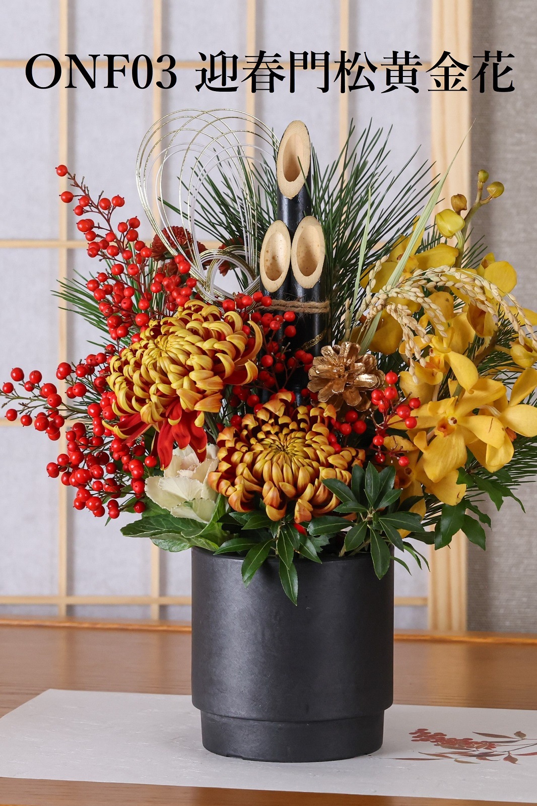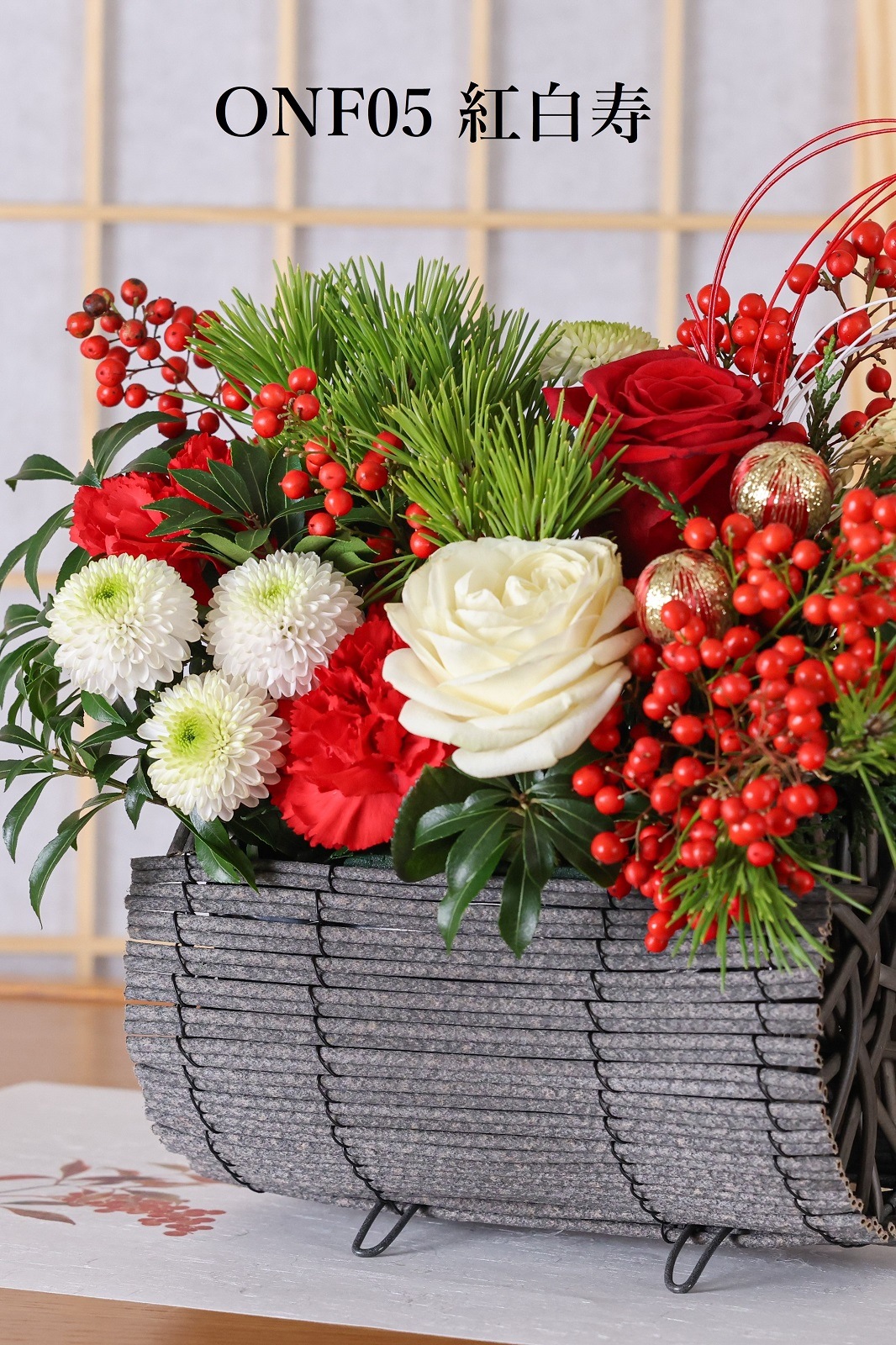 花の種類:松・マム・スプレーマム・葉牡丹・モカラ・南天の実・稲穂